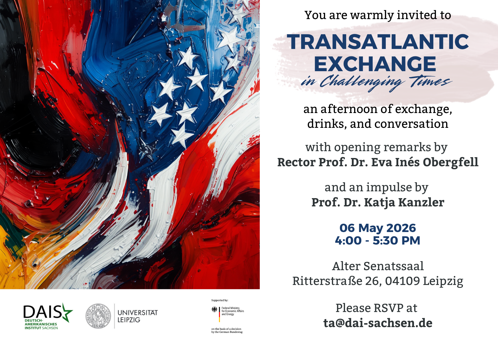 We are looking forward to welcoming remarks by the Rector of Leipzig University, Prof. Dr. Eva Inés Obergfell, as well as an impulse by chairwoman of the German-American Institute Saxony, Prof. Dr. Katja Kanzler. Afterward, there will be an opportunity for conversation and networking over drinks.